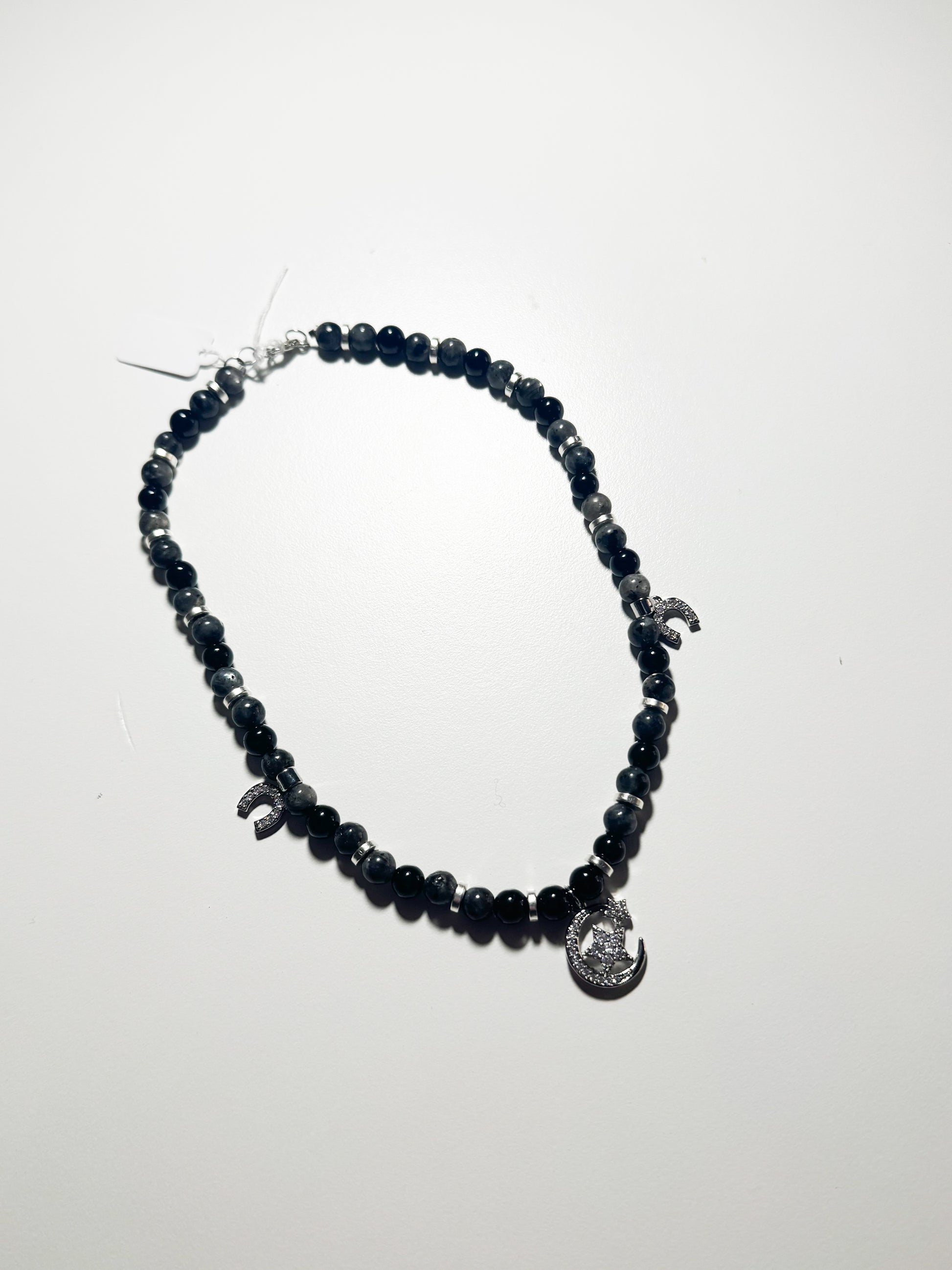 Collana ciondolo con luna e ferro di cavallo labradorite, calcedonio nero